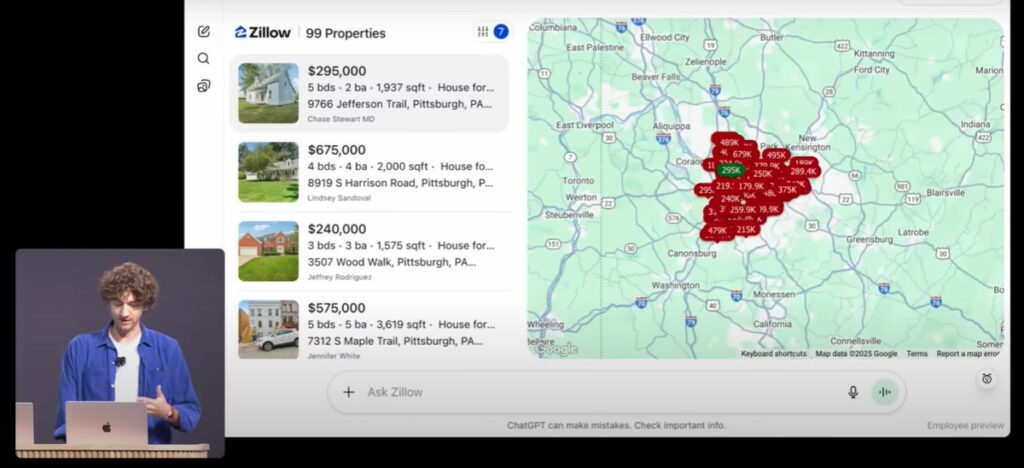 Zillow는 부동산 검색 플랫폼으로, 챗gpt에서 “예산 50만 달러로 시애틀 주택”과 같은 요청에 지도 기반 목록과 필터링 기능을 제공합니다. 가상 투어 연동으로 부동산 탐색이 한층 간편해졌습니다.