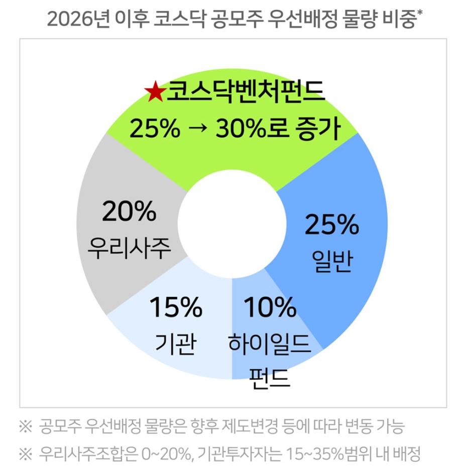 코스닥 벤처펀드의 또 다른 장점은 공모주 우선 배정 규정을 활용해 개인이 일반 청약을 받을 수 있는 것보다 높은 배정 배정 비율을 기대할 수 있다는 점입니다. 기존 25%였던 코스닥 공모주 우선 배정 비율이 2026년에는 확대되어 30%로 상향되었습니다. 이로 인해 신규 상장주를 남들보다 유리하게 확보할 수 있어 코스닥 벤처펀드의 투자 수익을 창출할 기회가 확대되었습니다.추가 수익을 기대할 수 있습니다.