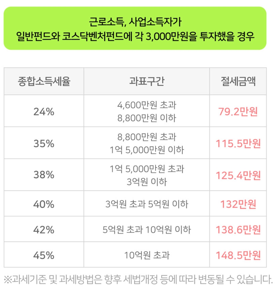 - 투자 한도: 별도의 가입 한도는 없으나, 1인당 총 투자금액 3,000만 원까지 10% 소득공제가 가능합니다.