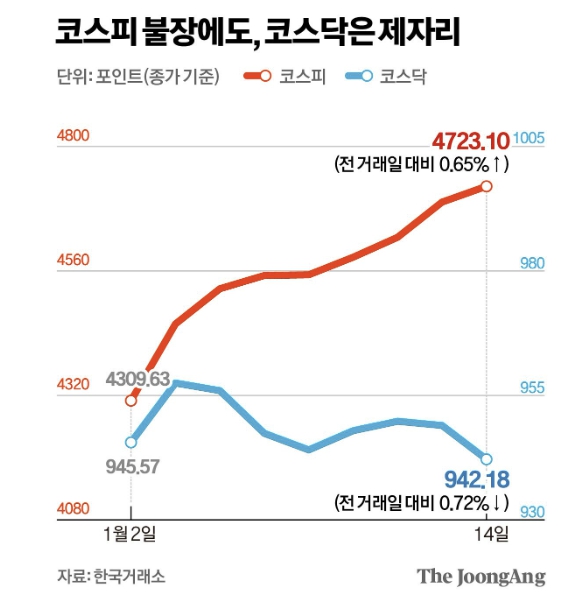 코스닥 시장은 혁신과 벤처 생태계의 핵심 플랫폼으로 신성장/혁신기업 등의 성장을 지원하는 기능을 수행합니다. 그러나 코스피 시장 대비 낮은 신뢰도, 부실기업의 퇴출 지연, 기관투자자의 소극적 참여 등으로 인해 증시 상승폭이 크지 않았습니다. 이를 반영하듯 2025년 연간 기준으로 코스피는 76% 상승한 반면 코스닥은 35% 상승에 그쳤습니다. 이 흐름은 2026년에도 이어져 코스피는 불장을 보이고 있지만 코스닥은 횡보하고 있습니다.