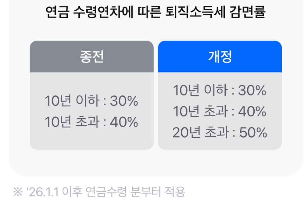 가장 큰 변화입니다. 퇴직금의 연금수령 시 받을 수 있는 퇴직소득세 감면혜택이 더 커집니다. 기존에는 퇴직금을 연금으로 받을 때 연금수령 연차 10년까지는 퇴직소득세의 30%를, 11년차부터는 퇴직소득세의 40%를 감면받을 수 있었습니다. 여기에 2026년부터는 20년 초과 구간이 신설되어 연금수령 연차 21년차부터는 퇴직소득세를 최대 50%까지 감면으로 확대되었습니다.